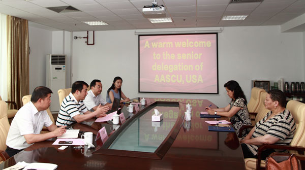 6月24日至26日,美国州立大学与学院协会(AASCU)国际部主任阿琳.杰克森女士,中国教育国际交流协会美国项目协调员、美国州立大学与学院协会联络员李苏菲女士一行来访我校。我校孙爱武校长,吴学敏副书记以及国际合作与交流处有关负责人在行政楼401会议室会见了来访的美国客人。