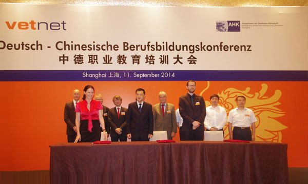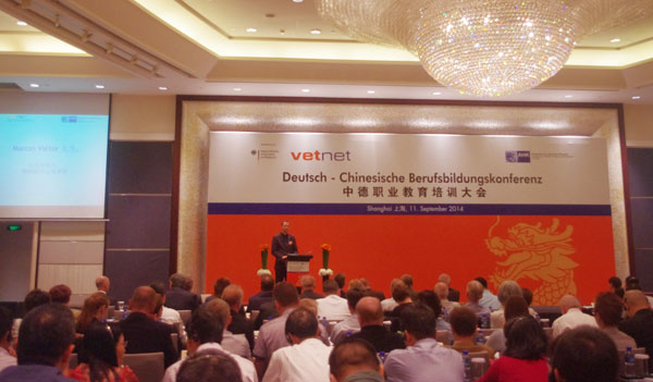 2014年9月11日-12日,德国工商大会上海代表处(英文简称AHK)主办的“2014中德职业教育大会”在上海举行。AHK董事会主席Rolf Kohler、首席代表Christoph Angerbauer、德国驻沪总领事馆文化处处长Marcel Vietor、德国联邦教育和科教部国际合作部主任Christian Stertz、德国联邦职业教育研究所教育主管Hannelore Kress、德国工商大会总部领导Michael Blank、Steffev Bayer、江苏省教育厅国际处处长林跃、德国工商大会教育集团总经理Friedhelm Rudorf等德国教育专家、德国驻韩国、马来西亚等国商会代表,国内德资企业和教育界代表共计200多人与会。我校校长孙爱武,党委副书记、副校长吴学敏以及党政办公室、国际合作与交流处、机械工程学院等有关人员参加了此次大会。