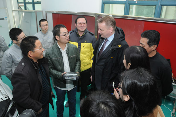 交流会后,博世汽车部件(南京)有限公司来访人员在孙校长等人陪同下参观了我校工业中心,并在实训现场与师生进行交流。
