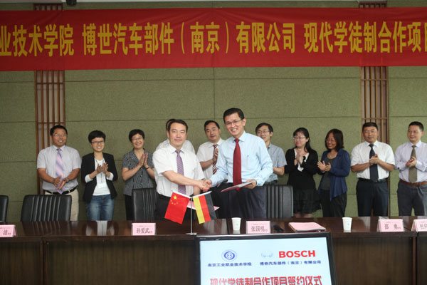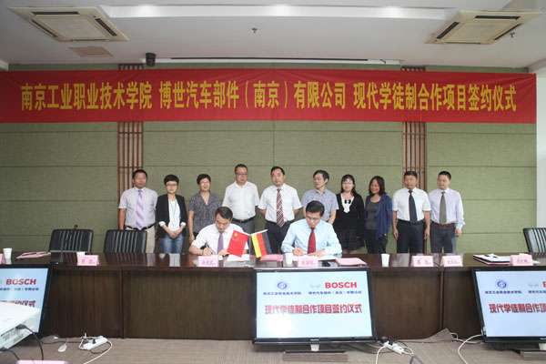 我校与博世现代学徒制合作项目自去年开始接触和洽谈,双方高层和相关部门数次互访和交流,中间经历了博世南京公司主管TGA项目的高层的人事变动,在孙爱武校长等校领导的关心推动和双方的共同努力下,该合作项目得以正式启动。该项目首期将面向机电类专业遴选20-25名学生组“博世班”,把AHK证书标准和内容融入课程与教材,校企按照共同研制的人才培养方案,交替实施系统的教学、技能训练和考核评价,学生毕业获取学校毕业证书和考取德国工商大会AHK证书。我校作为教育部首批现代学徒制试点院校,将此项目列入“现代学徒制”的试点,旨在以此为切入点推动相关专业教育教学改革,探索德国“双元制”培养模式的本土化创新与实践,真正实现校企一体化育人与就业,培养出具备中国特色、国际水准的职业化技术技能人才。