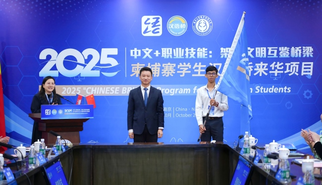 金尚军代表江苏省人民政府外事办公室向本次项目的顺利开营表示祝贺。他指出,中国和柬埔寨是真诚互信、守望相助的铁杆朋友,江苏始终将柬埔寨视作“一带一路”沿线的重要合作伙伴,双方在贸易、投资、教育、医疗等领域的务实合作成效显著。南京工业职业技术大学在柬建设了柬华应用科技大学,承办了多项教育人文活动,主动对接柬方的技能人才需求,为柬埔寨高素质青年人才培养做出了积极贡献。2025年是两国领导人共同宣布确立的“中柬旅游年”,本期汉语桥项目的举办正当其时。希望各位以此项目为契机,感受中国发展,传承中柬友谊,为共建中柬命运共同体贡献自己的智慧和力量。江苏省外办将不断丰富职业教育领域合作的形式和内容,赋能经济社会发展,促进两国民心相通。