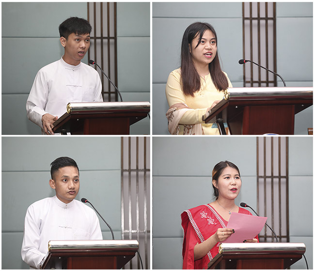随后,项目院校扬州工业职业技术学院、常州工程职业技术学院、江苏农牧科技职业学院分别对项目做了总结和回顾。四所项目院校的缅甸留学生代表分别发言,他们分享了在江苏三年的学习和生活体验,表达了对中国政府和学校的感恩之情。