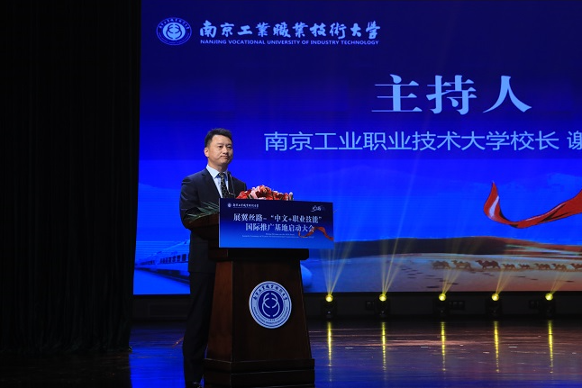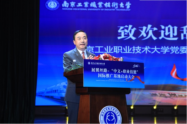 金秋璀璨,硕果喜人。11月5日,教育部中外语言交流合作中心与南京工业职业技术大学共建的全国首家“‘中文+职业技能’国际推广基地”在我校仙林校区重磅启动。教育部党组成员、副部长田学军,教育部政策法规司司长邓传淮,教育部中外语言交流合作中心党委书记、主任马箭飞,江苏省教育厅厅长、党组书记、省委教育工委书记葛道凯参加了启动仪式。南京大学党委常委、副校长王振林等专家学者,全体校领导、中层干部以及师生代表四百余人共同见证了启动仪式。党委书记吴学敏致欢迎辞,校长谢永华主持大会。