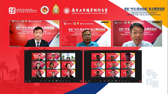 为推动国际中文教育与职业教育“走出去”融合发展,在海外实施“中文+职业技能”教育,推进具有中国特色、国际先进水平的“职业标准建设”,5月11日,教育部中外语言交流合作中心、中国东盟中心、老挝教育与体育部职业教育司、老挝驻华大使馆以及南京工业职业技术大学“中文+职业技能”国际推广基地共同举办的2022年老挝“中文+职业技能”本土师资线上培训项目正式开幕。老挝职业教育司副司长赛莎蒙·昂西在线出席开幕式并致辞,我校校长谢永华开启开班第一课,副校长孙雁飞致欢迎辞。来自老挝万象技术学院、万象河内友谊技术职业学院、老挝职业教育发展学院、老挝-印度创业发展中心、老挝理工学院、老挝-德国理工学院、帕克帕萨克技术学院、萨凡纳赫特技术职业学院、坎蒙省技术职业学院、琅勃拉邦职业技术学院等十余所职教院校的38名教师参加培训。