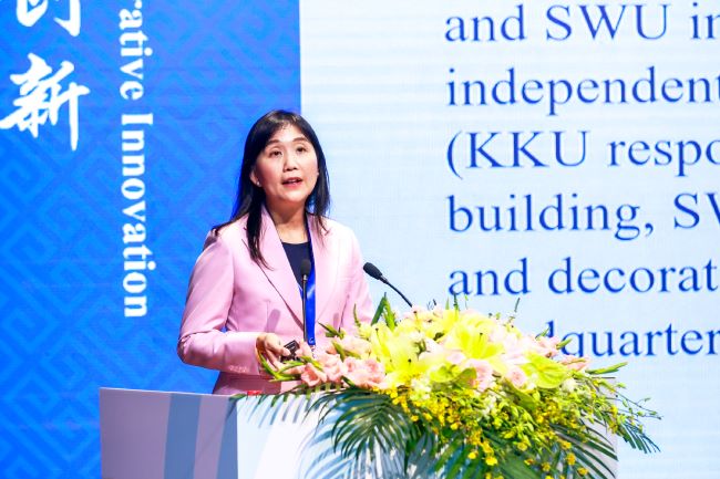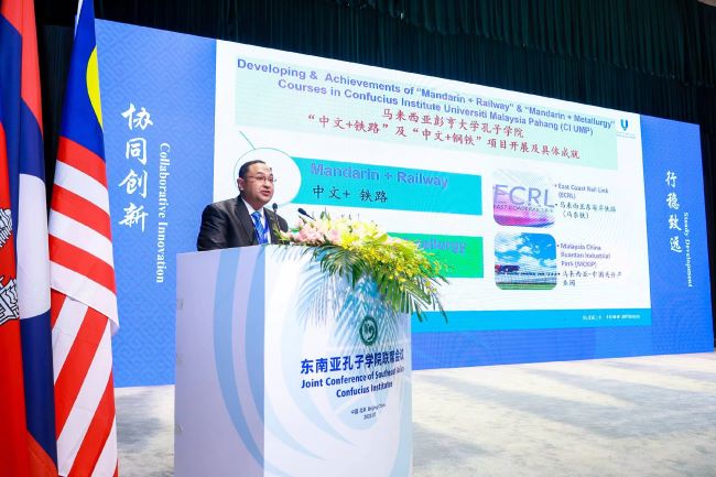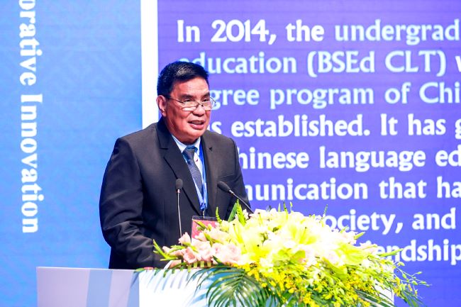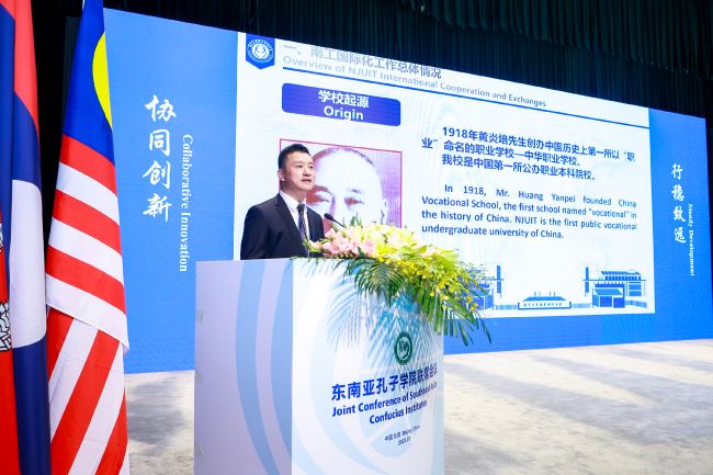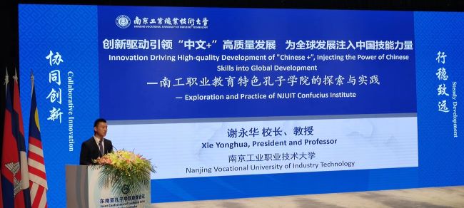 在联席会全会上,谢永华校长做题为《创新驱动引领“中文+”高质量发展,为全球发展注入中国技能力量——南工职业教育特色孔子学院的探索与实践》的主旨报告。他介绍了我校国际合作与交流总体情况以及我校推动职业教育特色孔子学院高质量办学的探索与实践经验。他指出,国际中文教育与职业技能融合已成为重要发展趋势。我校共建的柬华理工大学孔子学院开展两国共同认证的旅游管理、物流管理、电子商务、计算机网络技术等本科“双学历生培养”,从办学形式、教学组织和课程设置等方面,创新人才培养模式,强化校企合作,为柬埔寨培养本土化技术技能人才,推动中国职业教育教学标准走向世界,为“职教出海”提供了新发展路径。