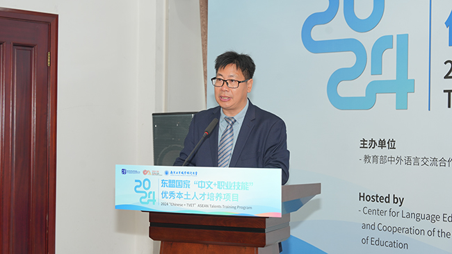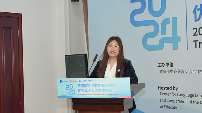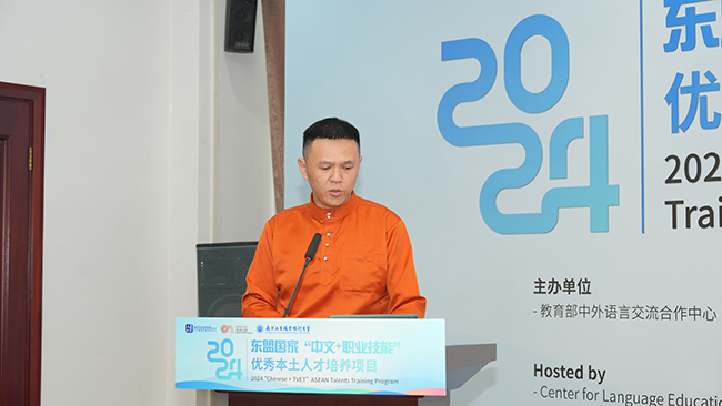 培训学员代表、马来西亚苏丹依德理斯教育大学本土教师黄榆柽(Wong Yoke Seng)首先代表全体学员对我校承办2024年东盟“中文+职业技能”优秀本土人才培养项目表示最诚挚的感谢。他表示,将珍惜这次学习机会,与授课老师和同学广泛交流,认真参与每项活动,全力提升自己的教学能力和职业技能,为“中文+职业技能”教育事业添砖加瓦。