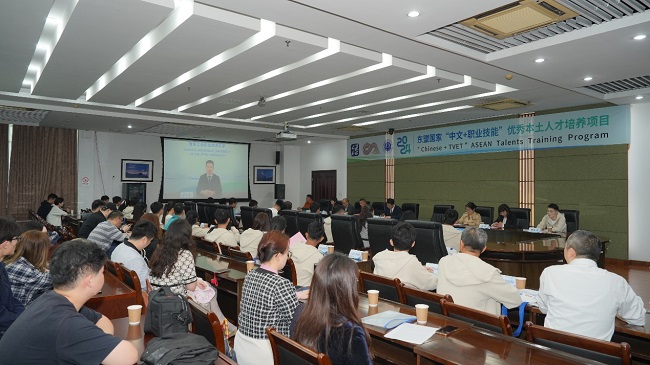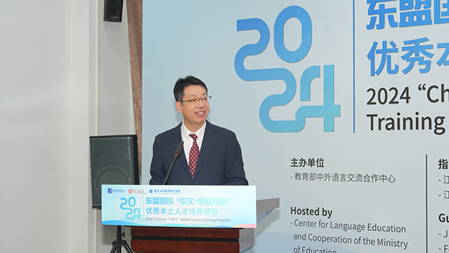 4月16日上午,由教育部中外语言交流合作中心、江苏省教育厅、江苏省人民政府外事办公室以及我校“中文+职业技能”国际推广基地共同举办的2024东盟国家“中文+职业技能”优秀本土人才培养项目开班仪式在我校举办。来自柬埔寨、马来西亚、泰国、缅甸、新加坡、越南、印度尼西亚、菲律宾等东盟国家31位优秀本土教师参加了开班仪式。我校党委副书记、校长谢永华以线上方式致辞,党委常委、副校长孙雁飞出席会议,商务贸易学院院长阮晓文主持本次活动。
